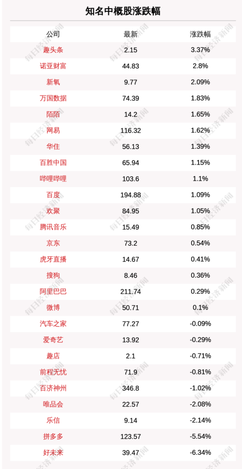 北京时间5月27日05:30,知名中概股中趣头条、诺亚财富、新氧、万国数据、陌陌涨幅居前,收盘分别上涨3.37%、2.8%、2.09%、1.83%、1.65%。好未来、拼多多、乐信、唯品会、百济神州跌幅居前,收盘分别下跌6.34%、5.54%、2.14%、2.08%、1.02%。