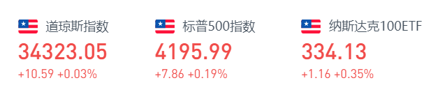 周三收盘,道琼斯指数涨10.26点,涨幅0.03%,报34322.72点;标普500指数涨8.09点,涨幅0.19%,报4196.21点;纳斯达克综合指数涨80.82点,涨幅0.59%,报13738.00点。