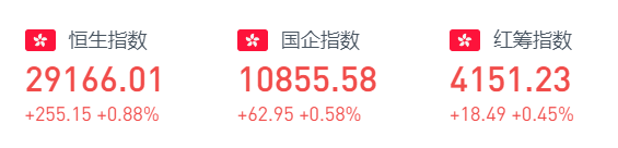 周三收盘,恒生指数涨255.15点或0.88%,报29166.01点,全日成交额达1642.96亿。国企指数涨0.58%,报10855.58点,红筹指数涨0.45%,报4151.23点。