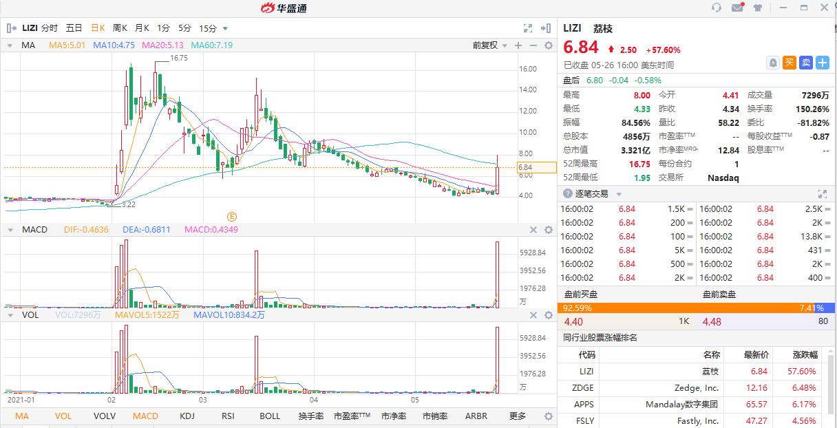 热门中概股周三收盘普涨 荔枝飙升逾57%