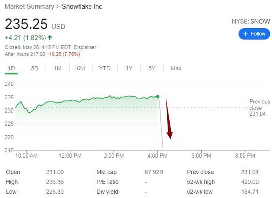 但财报公布后,Snowflake股价在美股盘后跳水,跌幅一度超过8%。在财报公布前,截至本周三收盘,Snowflake今年以来累跌约16%,明显不及大盘,标普500同期涨近12%。