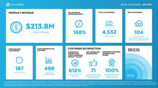 美东时间26日周三美股盘后,Snowflake自去年9月上市以来第二次公布季度财报。财报显示,截至4月30日的2022财年第一财季,营业收入继续保持100%以上的同比增速。主要财务指标和用户指标的表现如下: