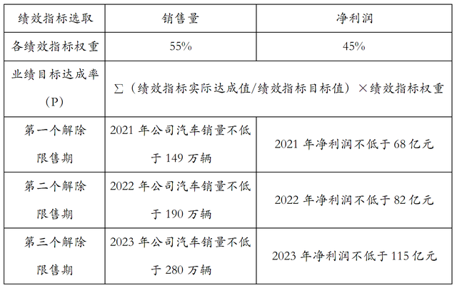 激励计划的行权考核年度为2021-2023年三个会计年度,销量考核目标分别为149/190/280万辆,净利润考核目标分别为68/82/115亿元。