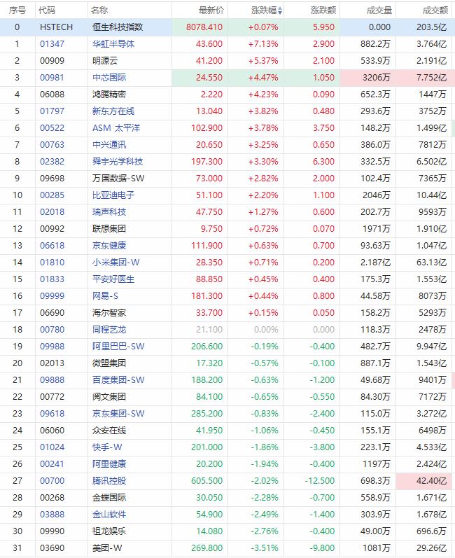 华虹半导体涨超7%;明源云涨超5%;鸿腾精密、中芯国际涨超4%;新东方在线、ASM太平洋、中兴通讯、舜宇光学科技涨超3%;比亚迪电子涨超2%。