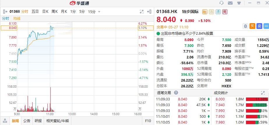 华盛资讯5月27日消息,特步国际今日持续强势上涨,截止发稿,特步国际上涨5.1%,现报每股8.04港元,总市值210.8亿港元,成交额1.229亿港元。股价高见8.09港元,刷新历史新高,该股连续四日累计涨幅超13%。