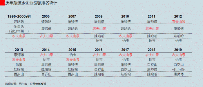早期占据市场的是娃哈哈和乐百氏。娃哈哈诞生于浙江杭州,乐百氏诞生于广东中山,两家公司均成立于80年代末,早期做的都是儿童饮品,后来切入到瓶装水领域后,两家在草莽的90年代跑马圈地,跟台资背景的康师傅一起,被称之为瓶装水的“老三王”。