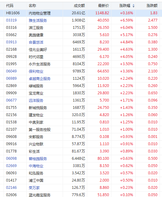 物管股近日获资金持续追捧,截至发稿,雅生活服务(03319)涨6.59%,报40.05港元;滨江服务(03316)涨6.04%,报26.35港元;奥园健康(03662)涨5.17%,报5.61港元;合景悠活(03913)涨4.84%,报8.23港元。