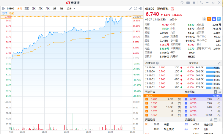现代牙科(03600)自3月16日起获资金持续追捧,年内累计涨幅超350%,该股尾盘再涨超20%,高见6.76港元,刷新历史新高。截至发稿,涨21.01%,报6.74港元,成交额7615万港元。