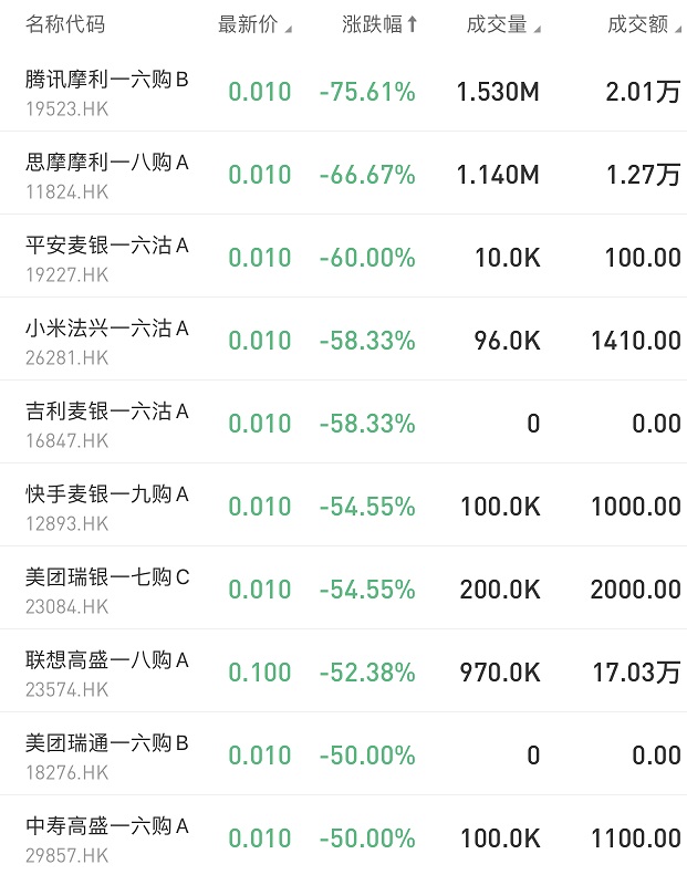 在今日跌幅榜中,腾讯摩利一六购B跌75.61%;思摩摩利一八购A跌66.67%。