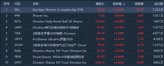 美股上个交易日涨幅前十的ETF