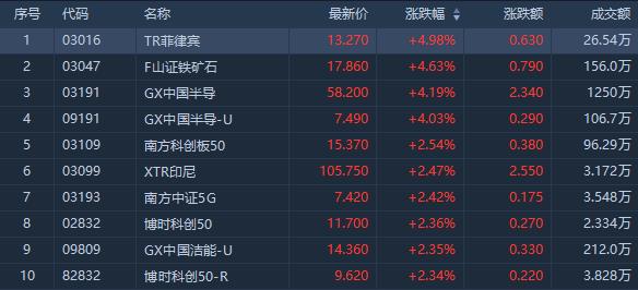 今日涨幅位居前的ETF有TR菲律宾涨近5%;GX中国半导涨超4%,成交额1250万港元。