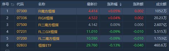 今日港股涨幅居前的恒指ETF有FL南方恒指涨0.05%,成交额1052万港元。