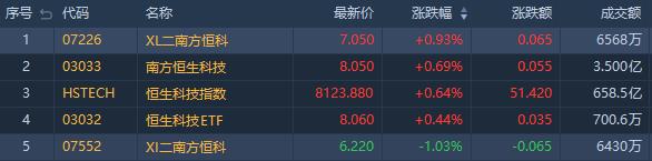 看多恒指相关ETF走强,南方两倍做多恒科(07226.HK)涨0.93%,成交额6568港元;南方恒生科技(03033.HK)涨0.69%,成交额3.5亿港元;