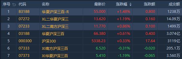 沪深300指数收涨0.33%。其中,华夏沪深三百-R(83188.HK)涨1.48%,成交额1238万港元;华夏沪深三百ETF(03188.HK)涨0.61%,成交额约3.07亿港元。