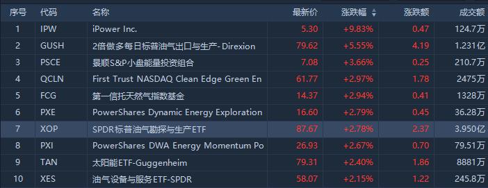 涨幅居前的有,2倍做多每日标普油气出口与生产的GUSH涨超5%,成交额1.23亿美元;标普油气勘探与生产ETF涨近3%,成交额3.95亿美元。