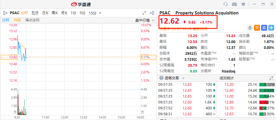 华盛资讯5月27日消息,美股早盘,Property Solutions Acquisition Corp. ( PSAC)一度涨近10%,截至发稿,该股涨超5%,周内涨幅近20%。
