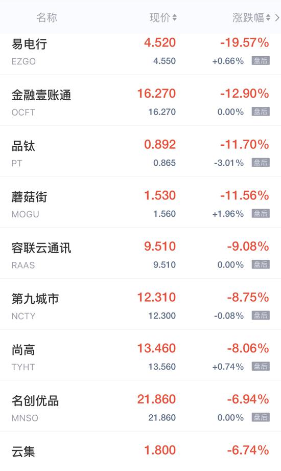 易电行跌超19%,蘑菇街跌超11%,第九城市跌近9%,名创优品、云集跌近7%,荔枝、波奇宠物跌超6%,云米科技跌超4%,拼多多、乐居跌超3%,新东方跌超2%,搜狐跌近2%。
