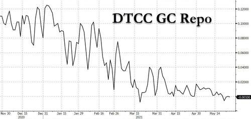 事实上,追踪一般抵押品(GC)金融回购协议每日市场利率的DTCC GCF回购指数在隔夜恰恰交投-0.01%,重返3月下旬以来的最低水平,是过多现金正在蜂拥追逐良好抵押品的信号。