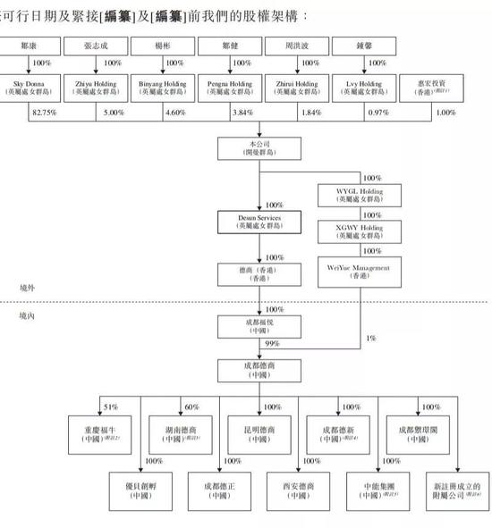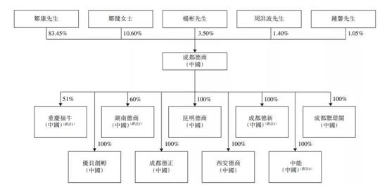 2021年3月24日,杨彬、邹健、邹康等原始股东均退出股东行列,新增成都福悦企业管理咨询有限公司(以下简称“成都福悦”)。据企查查显示,成都福悦的法人为周尤波,同时也是成都德商产投旗下多家分公司的法人。股权穿透图显示,成都福悦由Desun Property Service Limited全资控股。而这家境外公司的股东,依旧为邹康、邹健、杨彬、张志成、周洪波、钟馨等人,持股比分别为82.75%、3.84%、4.60%、5.00%、1.84%、0.97%。