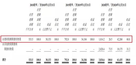这还是2020年德商产投在管建筑面积大幅度增长后的数据。据招股书披露,2018年德商产投的在管建筑面积为53.35万平方米,2019年的在管建筑面积为79.2万平方米。2020年,在管建筑面积猛然暴涨至380万平方米,同比2019年增长了380%。