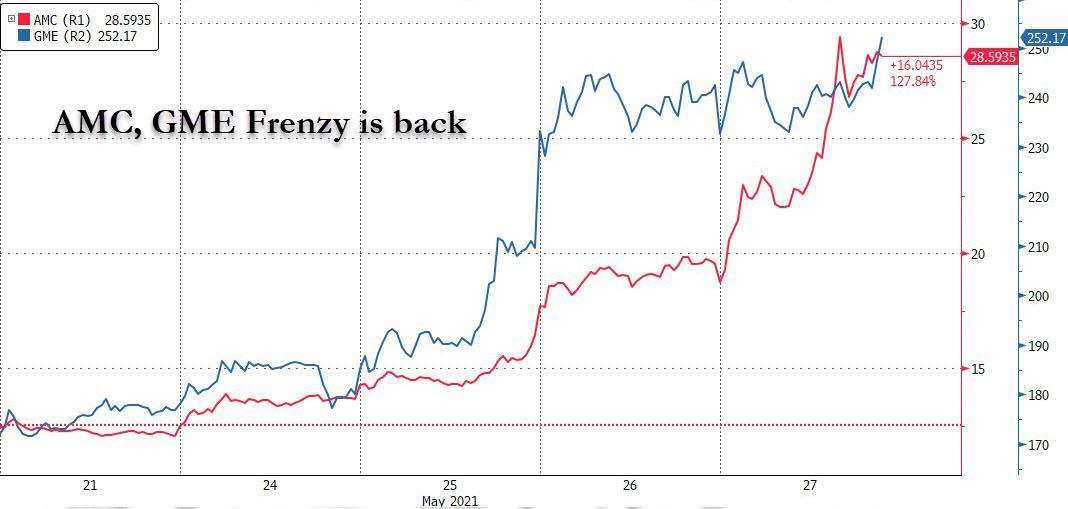最近几周,年初一时风光无限的散户抱团股似乎又有卷土重来之势。美东时间周四盘中,AMC院线一度大涨逾50%,创下自2017年5月以来的新高,随后回落,AMC最终收涨35.58%。