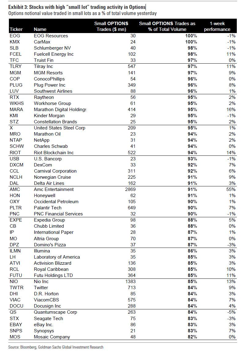 那么散户们都在买入什么呢?基于高盛的分析,散户们周三交易最活跃的50只股票如下: