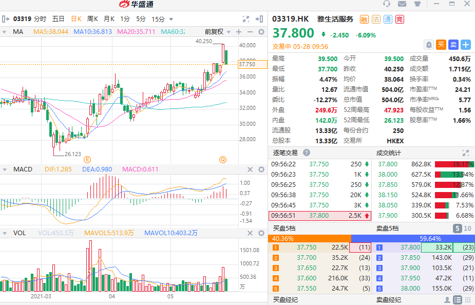 华盛资讯5月28日消息,据雅生活服务此前公告,拟配售8666.68万股,净筹约32.42亿港元;今日股价低开低走,现跌6.09%,报37.8港元每股,暂成交1.715亿港元,最新总市值504亿港元。