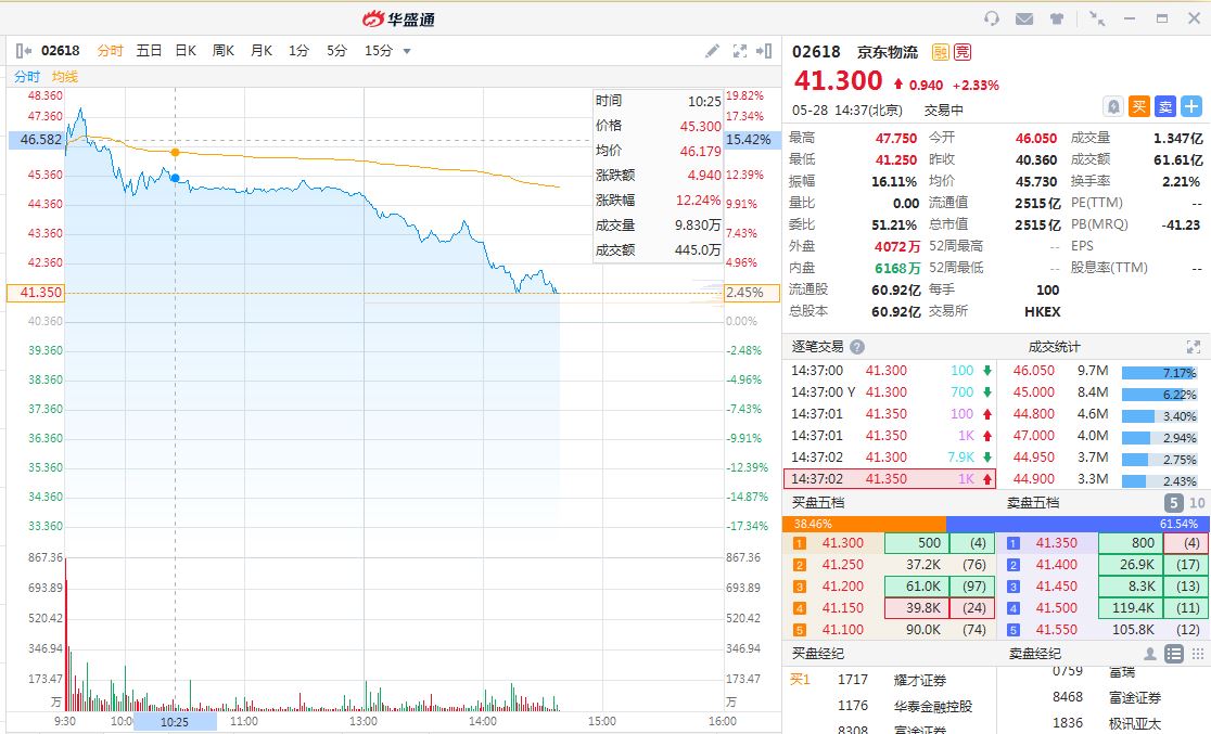 华盛资讯5月28日消息,京东物流今日高开低走,曾涨逾14%,午后加速下落,盘中涨幅收窄至2.33%,现报41.3港元,最新总市值为2515亿港元。京东物流发售价定为每股股份40.36港元,昨日暗盘一度涨逾20%。