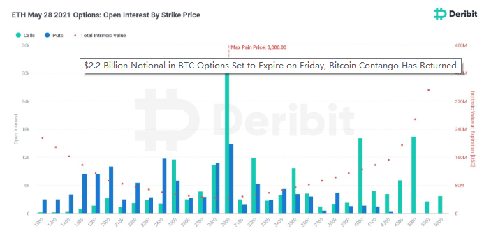 数据显示,Deribit本周五将有48469份BTC期权合约(价值19.5亿美元)和307558份ETH期权(价值8.77亿美元)到期。在截至5月23日的两周内,所有到期日的未平仓合约几乎减半至65亿美元。