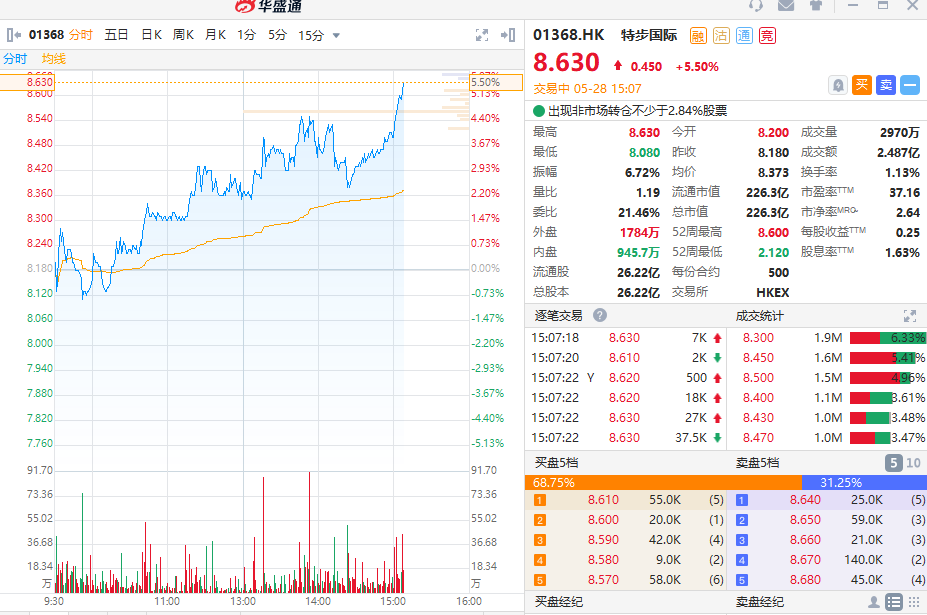 华盛资讯5月28日消息,特步国际今日盘中持续攀升破顶。截至发稿,特步国际上涨5.5%,现报每股8.63港元,总市值226.3亿港元,成交额2.487亿港元。该股连续6个交易日呈现上涨行情,三个月累计暴涨近140%。