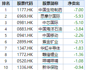 本周,南下资金沽出中国生物制药7.00亿港元,位列抛售额第一。此外,南下资金还抛售思摩尔国际5.93亿港元,位列抛售额第二。中芯国际、中国海洋石油等个股也遭到抛售。