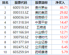 本周北上资金买入金额最多的标的为贵州茅台,一周净买入46.71亿元。美的集团获净买入29.82亿元,招商银行获净买入23.99亿元。中国平安、五粮液、兴业银行等也获港资加仓。