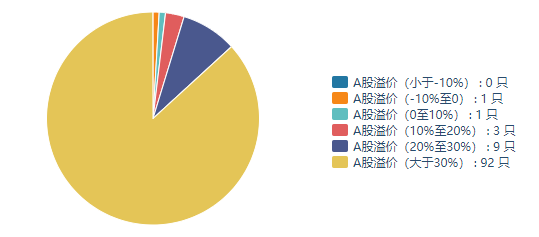 本周有92只A股溢价超过30%,9只溢价在20%至30%之间,3只在10%至20%之间,有1只溢价在10%之内,有1只溢价在-10%至0%之内。