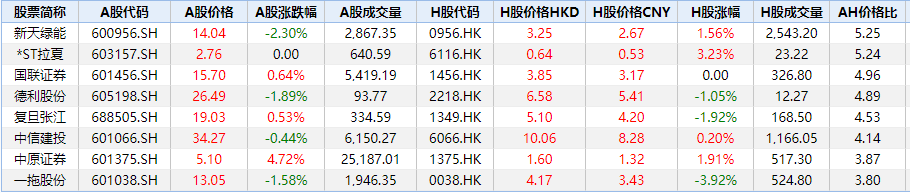 个股方面,新天绿能、*ST拉夏、国联证券、德利股份、复旦张江、中信建投、中原证券和一拖股份等个股位列沪港通溢价榜前列,投资者可关注相关个股估值回归机会。