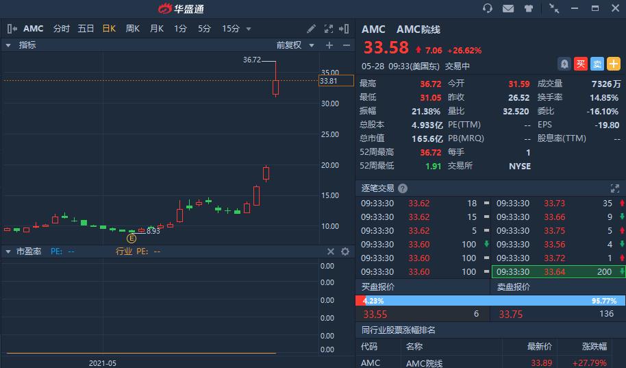 美股散户抱团大战空头机构的戏剧性一幕周四继续上演,本次对决的焦点股从游戏驿站变成了美国最大院线AMC。在散户合力买入的支持下,AMC院线周四大涨35.6%,本周累计涨幅已经接近120%,而做空AMC院线的投资机构,本周累计损失已达13亿美元。