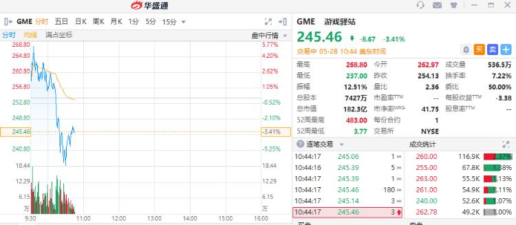 截至北京时间22:44,游戏驿站(GME)转跌超3%。此前该股一度涨超5%,日内振幅约为12%。