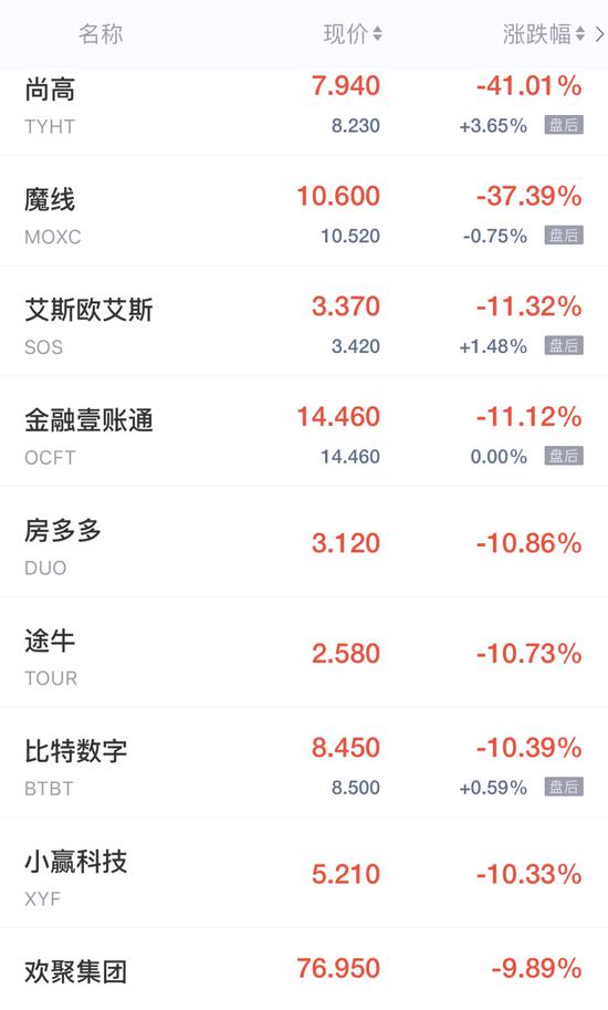 房多多、途牛跌近11%,比特数字、小赢科技欢跌超10%,欢聚集团跌近10%,雾芯科技、高途、名创优品跌超3%,涂鸦智能、水滴跌超2%,爱奇艺、理想汽车、陆金所、斗鱼、网易有道跌超1%。