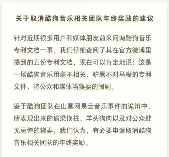 对此,可以联系网易云音乐下场手撕酷狗音乐进行补充理解。2月时,网易云音乐公开指责,“酷狗团队在山寨网易云音乐事件的诡辩中,所表现出来的偷梁换柱、羊头狗肉以及对公众肆无忌惮的糊弄”,还跨企业建议“申请取消酷狗音乐相关团队的年终奖励”。究其实质,双方的焦点是知识产权问题,那么放置在网易云音乐极其创作者之间,网易云音乐不该反省?