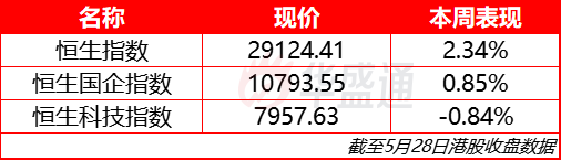 恒生指数本周涨2.34%,报29124;恒生科技指数本周跌0.84%,报7957;国企指数本周涨0.85%,报10793。