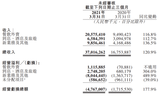 美团(03690)2021年Q1经营亏损47.67亿 新业务亏损超80亿
