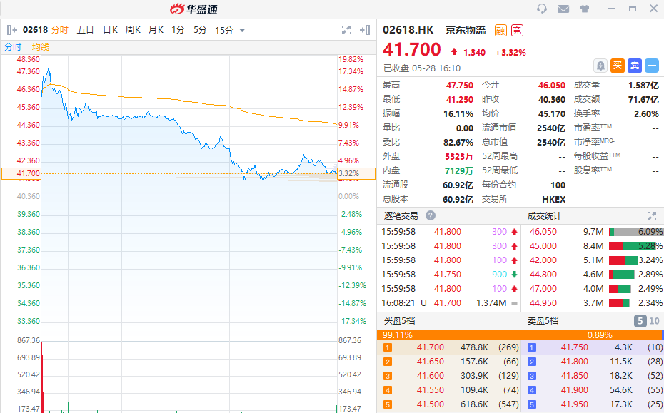 京东物流(02618)上市首日收涨3.32%,每股定价40.36港元