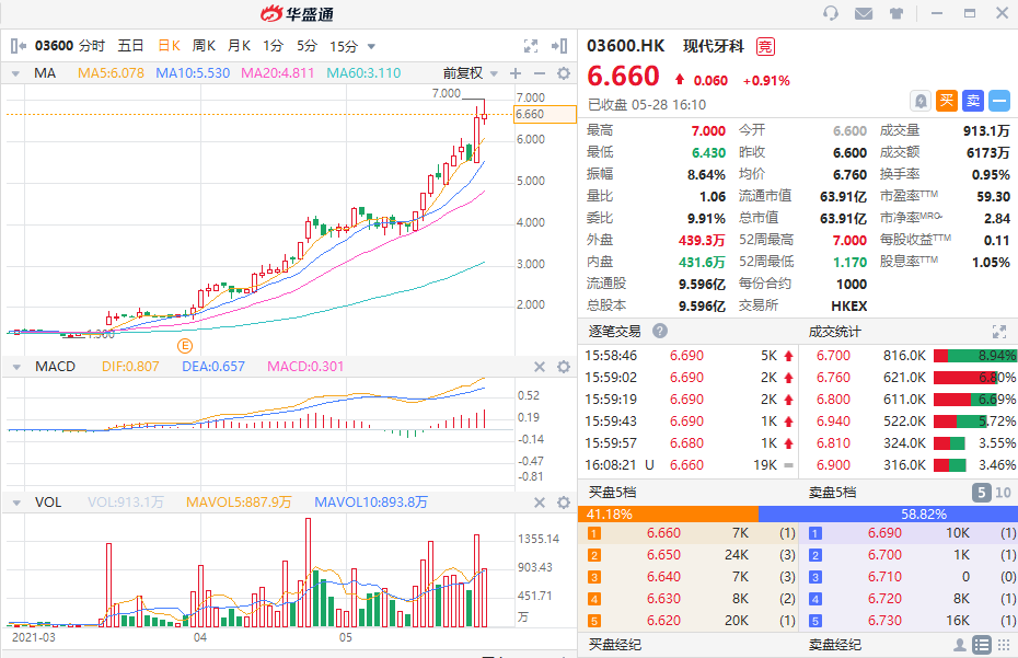 全球领先的义齿器材供货商现代牙科周五股价再度拉升,收报6.66港元。盘中最高见7港元创历史新高,该股自3月16日起累计涨逾300%。据了解,现代牙科是一家全面的牙科耗材制造商,主要负责义齿代工,也有矫正和种植产品的加工,目前是全球最大的义齿生产商之一。券商预计中国种植牙潜在市场约为1143亿元,对标美国齿科消费结构计算,2019年我国口腔医疗潜在市场规模已高达9375亿元。