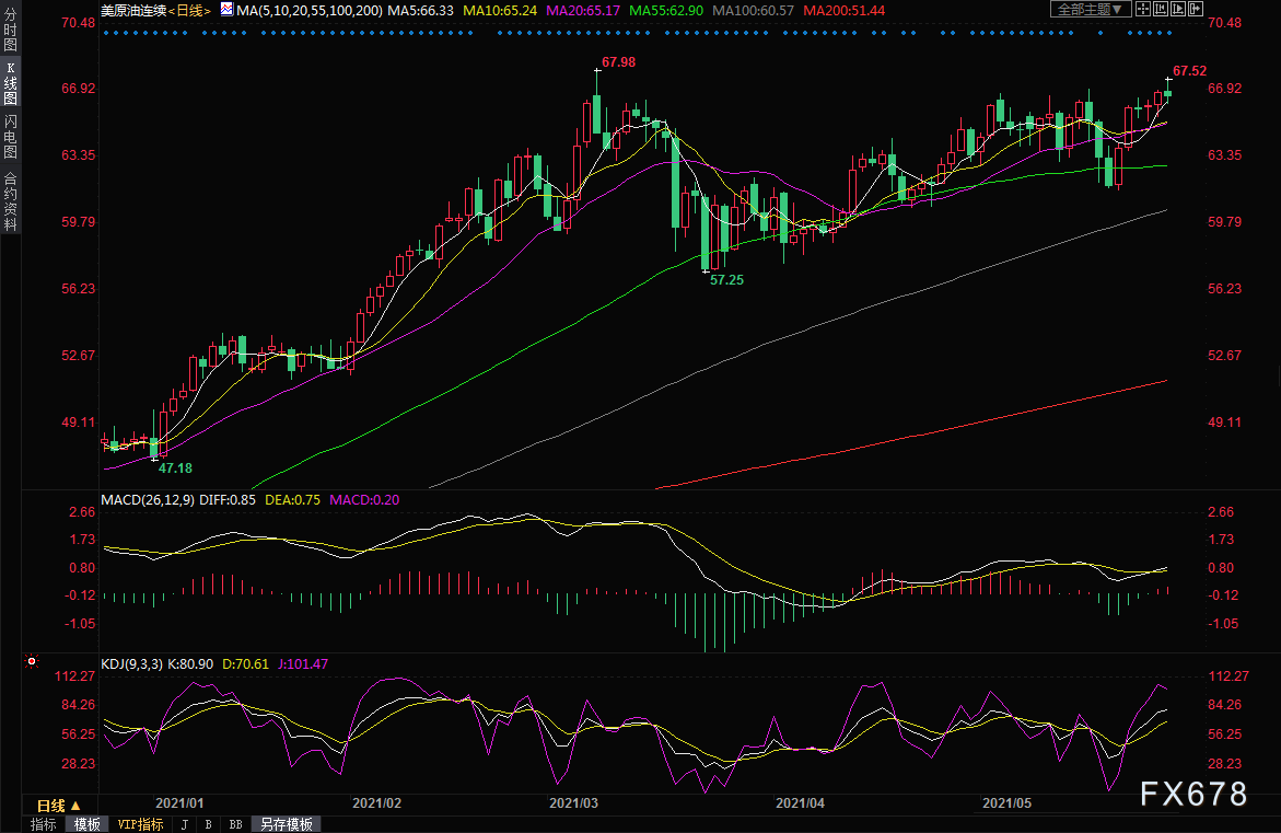 期货最高触及67.52美元/桶,为3月8日以来新高,收报66.63美元/桶,本周累计上涨4.3%,在美国阵亡将士纪念日假期前夕录得4月中以来最大单周涨幅,这个假期也将开启美国夏季驾车高峰期。