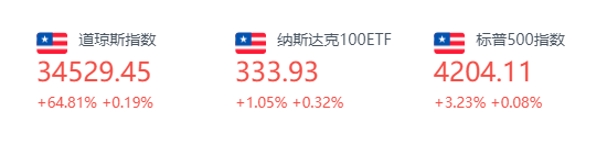 上周五收盘,道指涨约65点,或0.19%,报34529.45点;纳指涨12.46点,或0.09%,报13748.74点;标普500指数涨3.23点,或0.08%,报4204.11点。