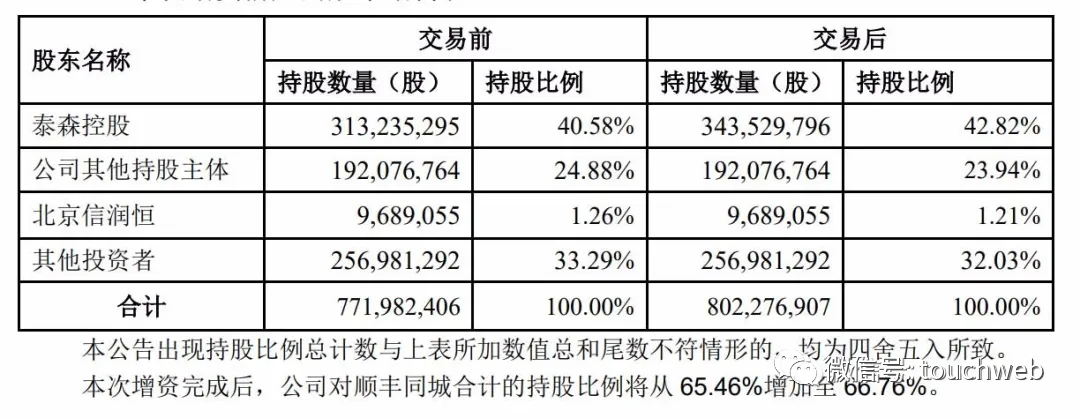 此次增资前,泰森控股持有顺丰同城40.58%股权,顺丰控股其他持股主体持股为24.88%,北京信润恒持股1.26%,其他投资者持股为33.29%。