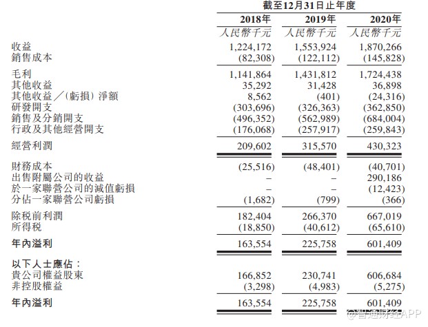 该公司的净利润自2019年至2020年大幅增加人民币3.757亿元,主要由于(a)埃克替尼销量增加,及(b)于2020年有关出售附属公司之收益的非经常事件。