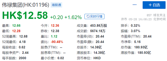 伟禄集团,截至5月28日收市,市值约180.93亿港元。