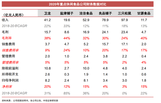 6家公司中,卫龙的收入规模排第4,毛利率排第2,费用控制得比同行要好,销售费用+管理费用占比仅为14%,于是净利率也就排名第一。