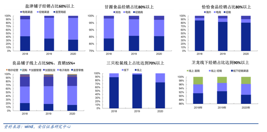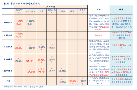 同行中,盐津铺子、甘源食品、洽洽食品主要也采取经销商模式;三只松鼠主要依靠线上销售,占比70%以上;良品铺子则线上线下对半开,各占50%。