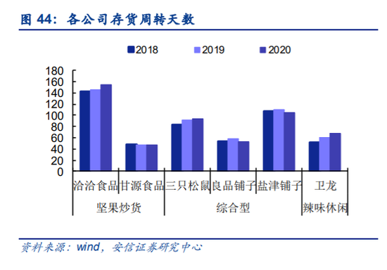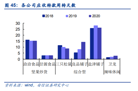 盐津铺子因销售渠道中大商超的销售占比较高,应收账款周转天数在行业中最高,2020年为26天,而三只松鼠主要为线上销售、应收账款周转天数约9天。